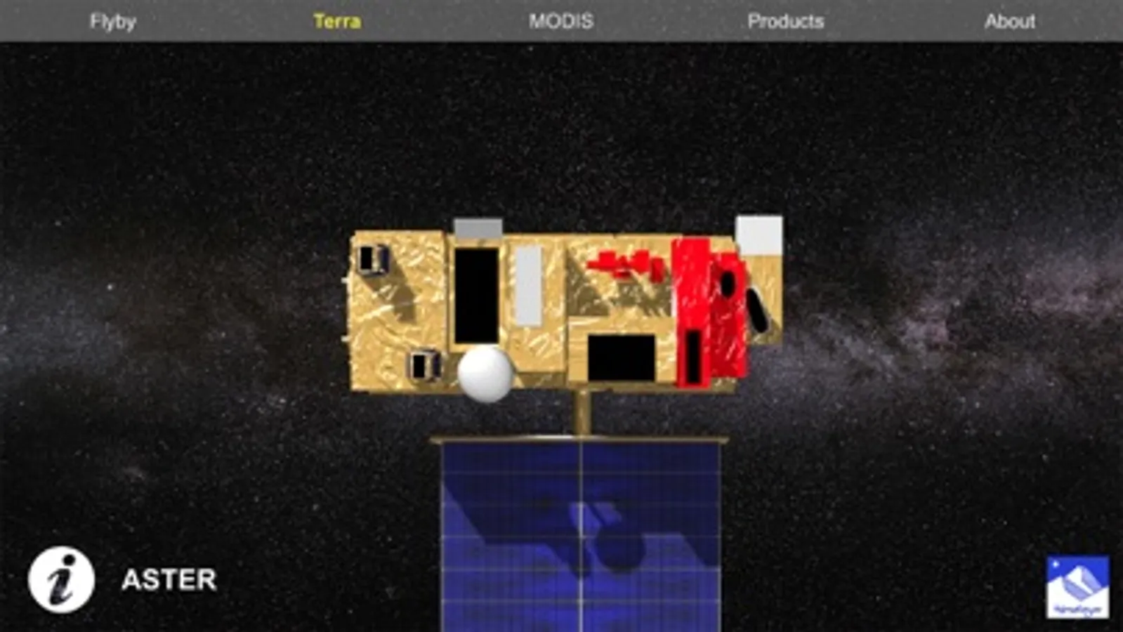 Global design of the NASA Terra satellite, represented along with its equipment and some data products. The application allows the user to interact with a 3D model of the NASA Terra satellite in order to learn the way it works, the payload and equipment present in the system, and the kind of data the satellite obtains to perform detailed observations of the Earth. Very useful to introduce in satellite development and EOS missions.