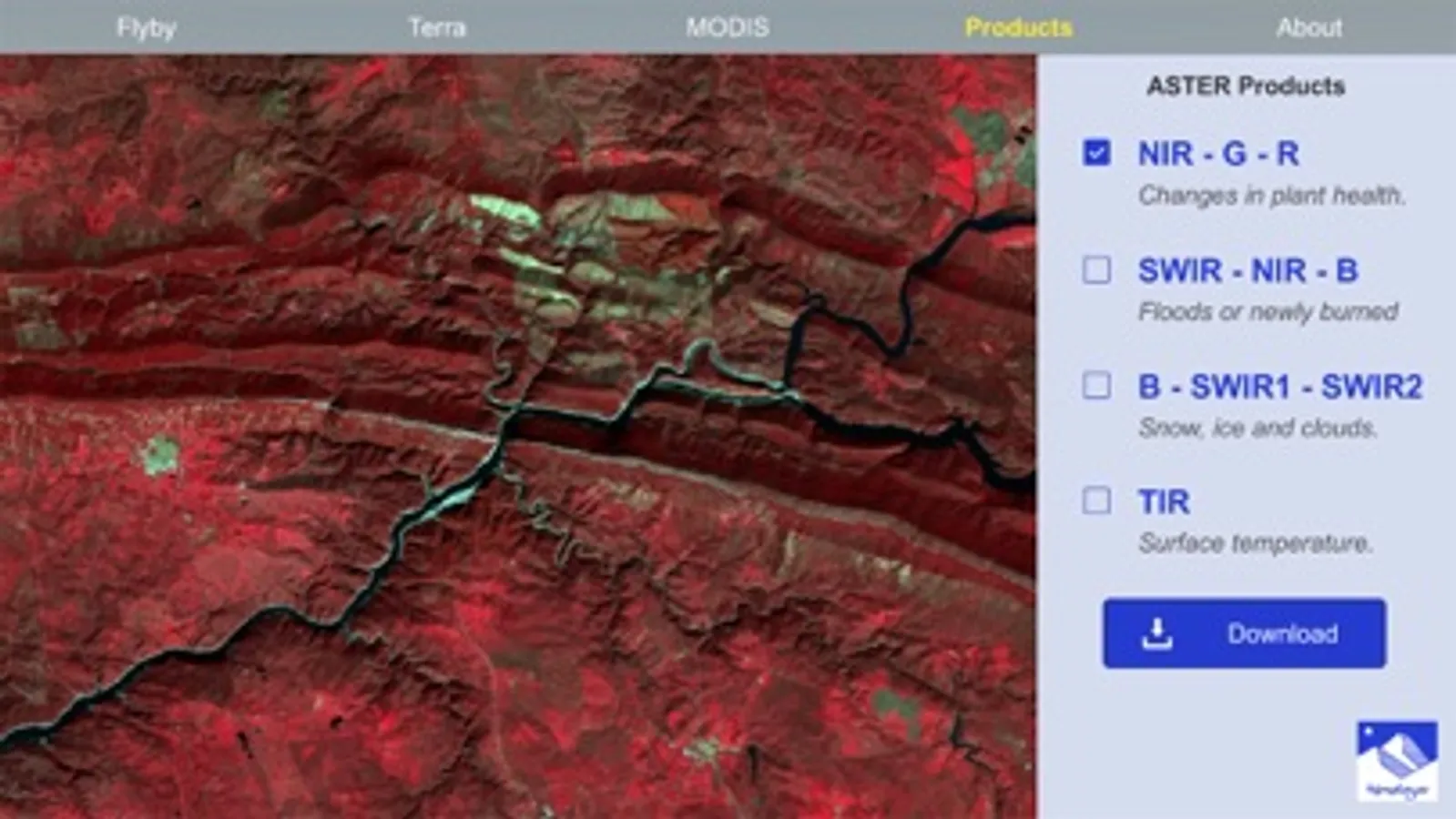 * Products: Visualization of processed data acquired by the Terra ASTER instrument. The area belongs to Monfragüe National Park (Spain), and it can be observed using different band combinations, which allow to highlight certain characteristics. The scene also presents a simulation of an user login procedure to download the original satellite products.