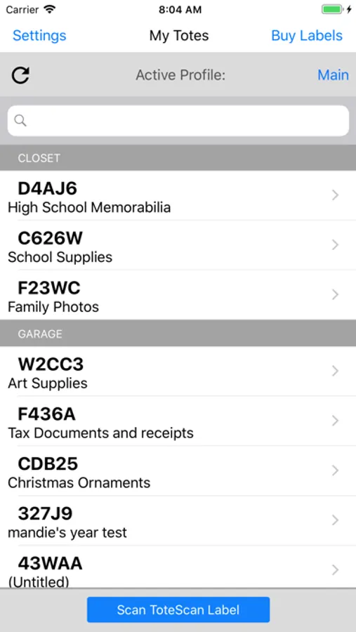 With ToteScan you can easily itemize your storage totes and containers to help you quickly find the things you need. ToteScan works by scanning official ToteScan labels. The ToteScan labels are individually connected with your account, and by affixing them to your totes and containers, you can easily scan and add items that you place into the containers. Once entered, you can use the built-in text search capability to find totes by name, individual item name, description, or keyword.