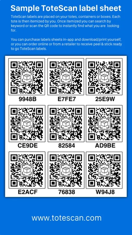 Additional ToteScan labels can be purchased in-app and digitally delivered to you by email link. You can then print them on basic paper, cut them out, and tape to your totes and containers. Or you can choose to buy pre-printed ready to peel and stick ToteScan labels and have them shipped to you.