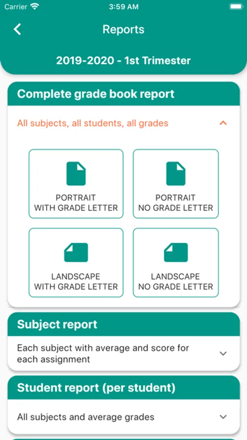 When you're ready to print out your reports, there are several reports that you can choose from! You can print your entire class report, an individual student, all students, individual subjects or all subjects.