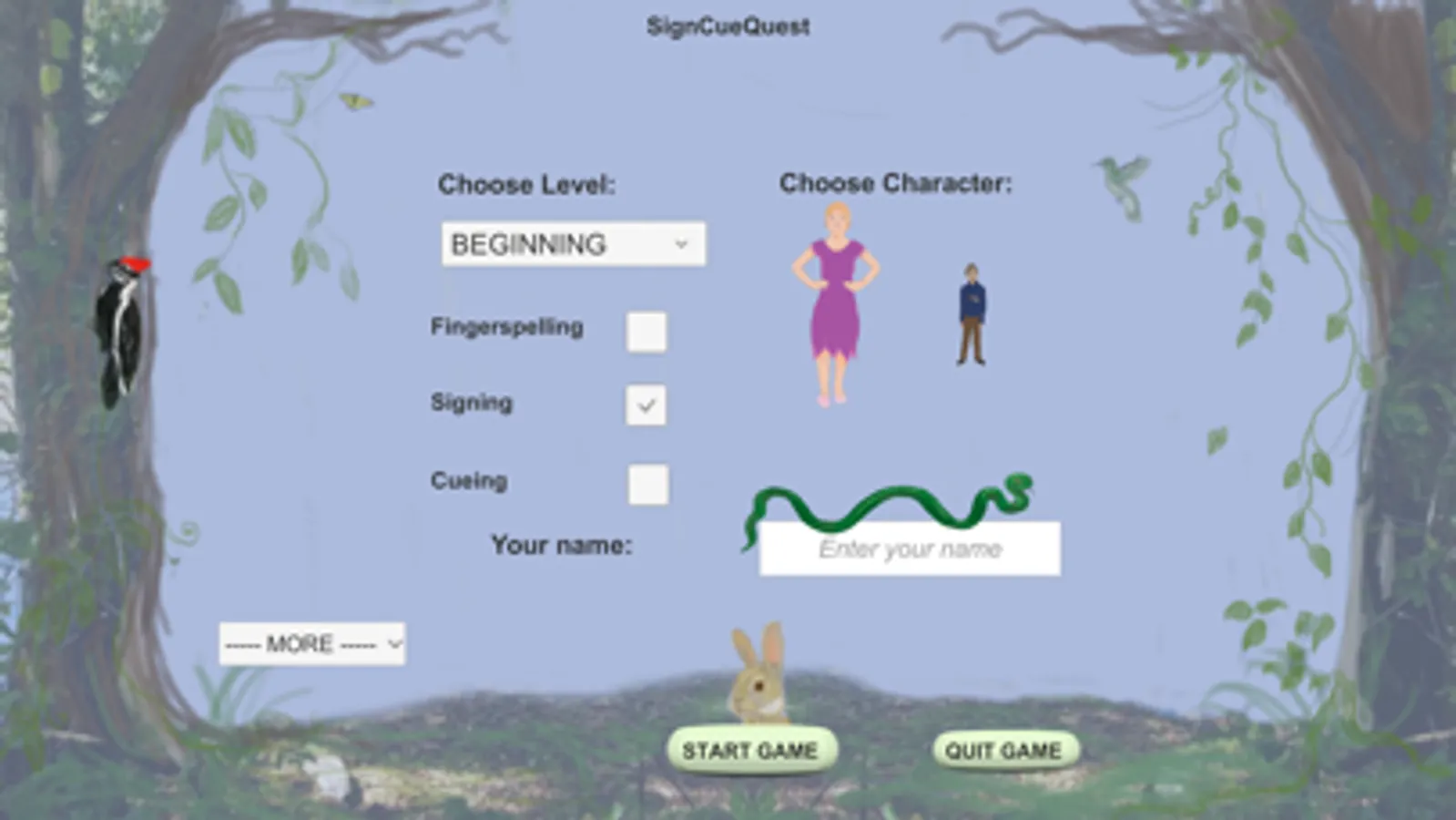 Select the communication style you want to use: ASL, Fingerspelling or Cued Speech. Set the game level to use: Beginning, Intermediate or Advanced. When you successfully complete the game, you can play the mini-quests in the Expanded Universe, or you can restart it with new settings to play again.