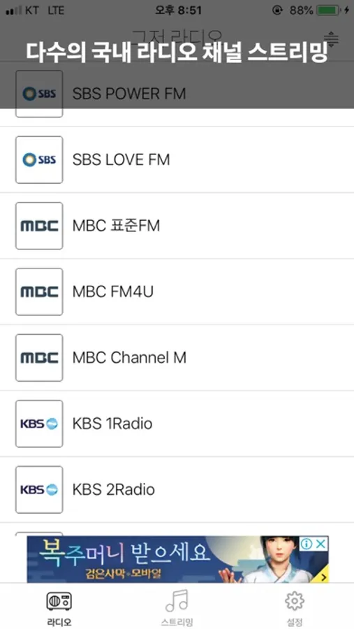 SBS POWER FM, SBS LOVE FM, MBC Standard FM, MBC FM4U, MBC Channel M, KBS 1Radio, KBS 2Radio, KBS 3Radio, KBS ClassicFM, KBS CoolFM, UBC Ulsan Broadcasting FM, G1 Gangwon Minbang FM, EBS FM, EBS Foreign Language Radio , YTN Radio FM, arirang Radio, TBS Traffic Broadcasting FM, TBS Traffic Broadcasting FM, CBS Standard FM, CBS Music FM, CBS JOY4U, cpbc Radio, BBS Buddhist Broadcasting, KFM Game Broadcasting, Korean Music Broadcasting, Original Sound Broadcasting, TBN
