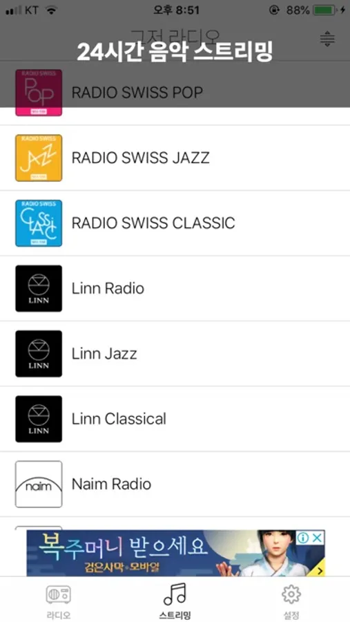 You can listen to various music such as POP, JAZZ, CLASSIC, and K-POP for 24 hours.