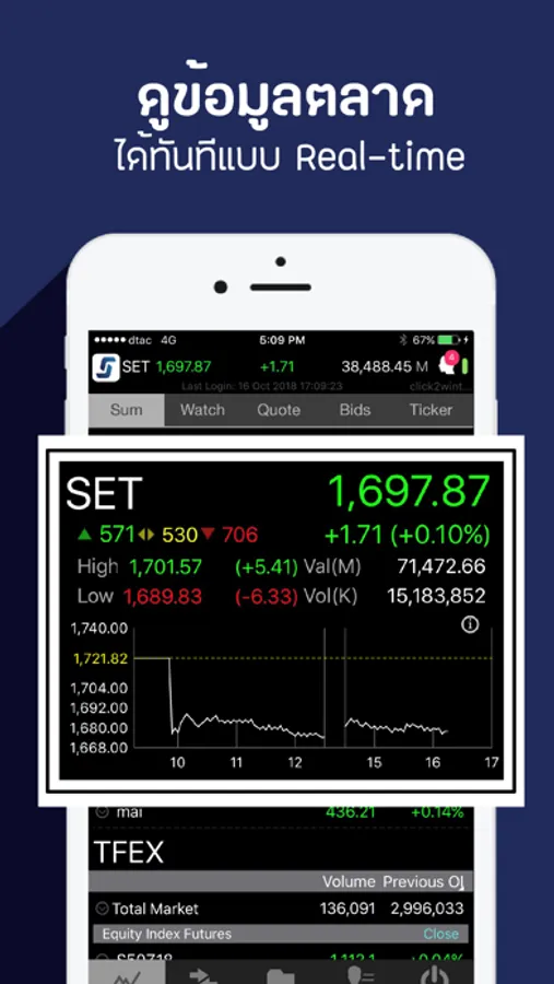 Realtime - To view Equity and Derivatives's market summary, create your favourite lists, view top ranking, information, statistics bids/offers and ticker of stock or futures/options series.
