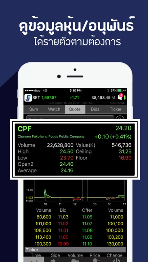 Realtime - สำหรับดูข้อมูลในตลาดหุ้นและอนุพันธ์, สร้างรายการ favourite ดู top ranking ดูข้อมูลพื้นฐานและสถิติ ข้อมูลการเสนอซื้อเสนอขาย และความเคลื่อนไหวของการซื้อขายของหุ้นหรืออนุพันธ์