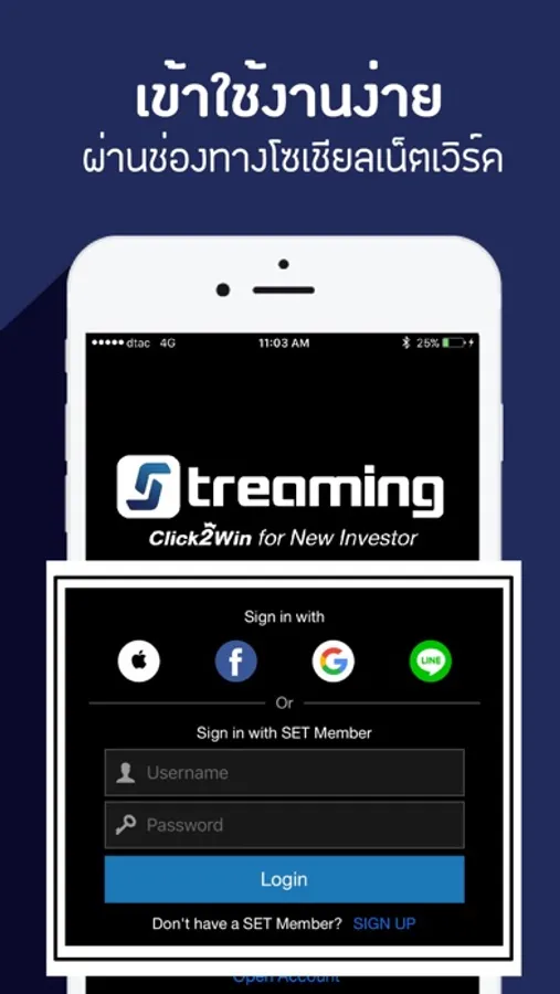 Streaming Click2Win เป็นแอพพลิเคชั่นสำหรับจำลองการซื้อขายหุ้นและอนุพันธ์ สามารถ Login ได้สะดวกผ่านช่องทาง Apple, Facebook, Line หรือ Gmail ให้คุณสามารถเข้าถึงการดูข้อมูลในตลาด จำลองการซื้อขายหุ้นและอนุพันธ์ได้สะดวกมากขึ้น