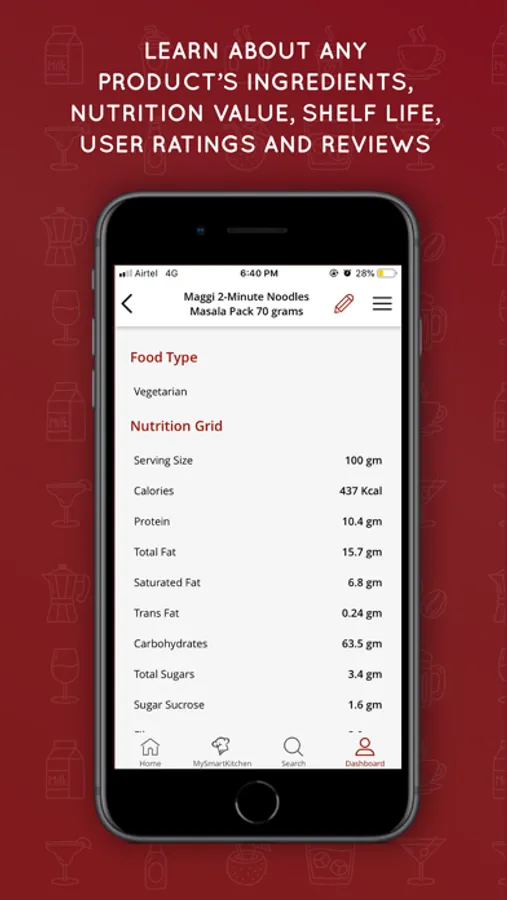 * Scan the barcode of any food product and know about its ingredients, nutritional value, shelf life, user reviews and ratings.