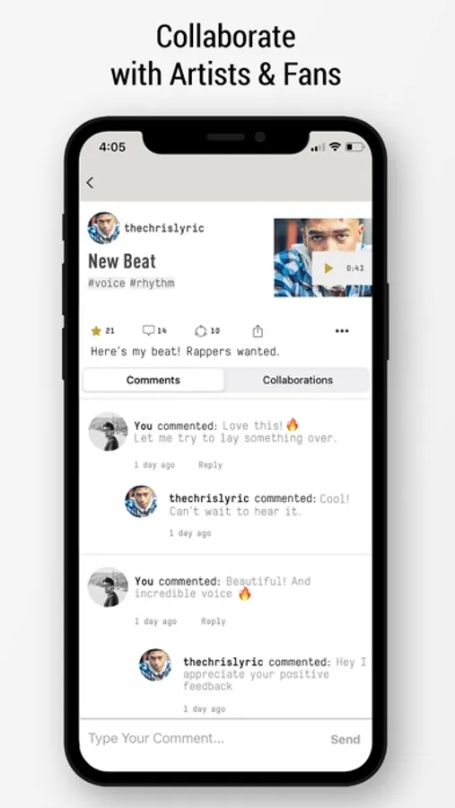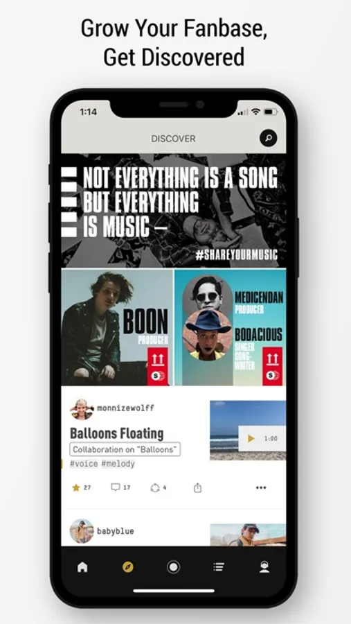• Promote your music by posting, sharing, tweeting, hashtags, and messaging with fans, artists, and producers