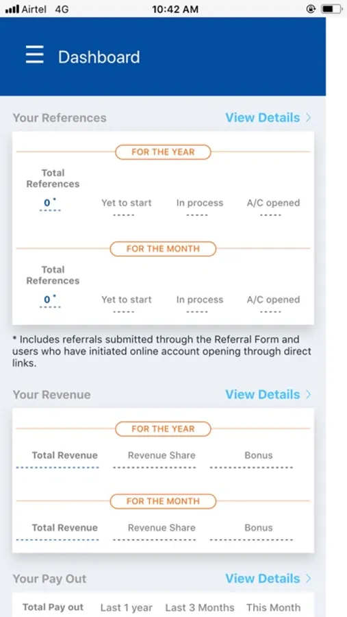 Get access to your referrals data, their account opening status, revenue generated by them and your pay-out details, all within one app.
