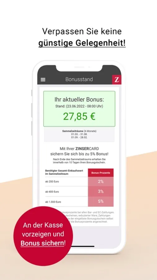 • App bei Ihrem nächsten Einkauf an der Kasse vorzeigen und Bonus sammeln oder einlösen
