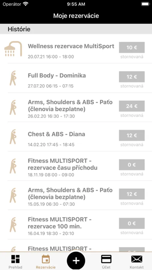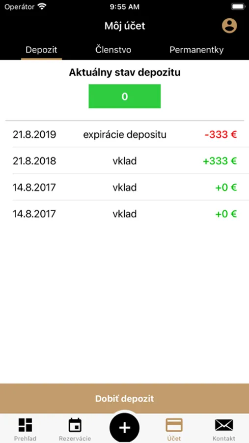 • vidieť prehľad svojho účtu (depozit, členstvá, permanentky)