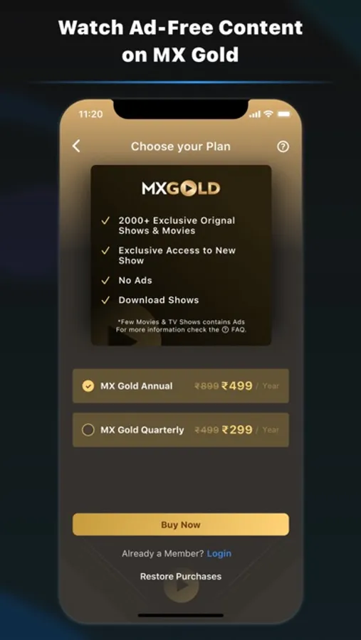 Enjoy ad-free streaming of Web Series, Top Movies, and get early access to new releases with MX Gold subscription at less than 1 INR a day!