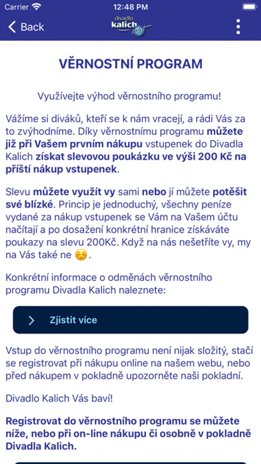 Díky mobilní aplikaci můžete mít přehled o všech akcích divadla, ale především o speciálních akcích, předpremiérách a vstupenkám na poslední chvíli. Věrnostní program Divadla Kalich Vás může odměnit již při prvním nákupu vstupenek.