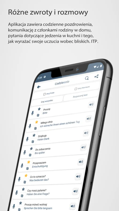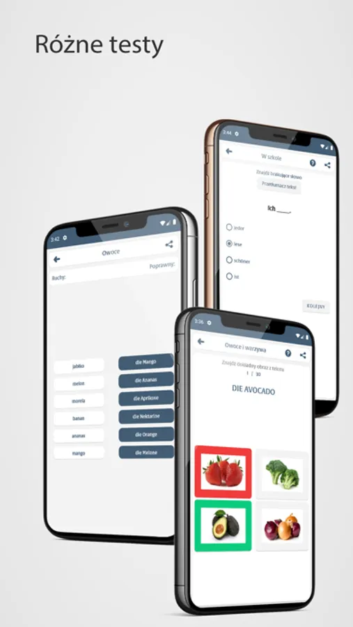 Sprawdź swoją wiedzę za pomocą różnych typów testów oferowanych przez aplikację, takich jak: łączenie słów o tym samym znaczeniu, znajdowanie poprawnej odpowiedzi z obrazka, tłumaczenie słowa lub zdania, odsłuchiwanie zdania, a następnie jego pisanie, wypowiadanie zdania które się pojawia i nie tylko.