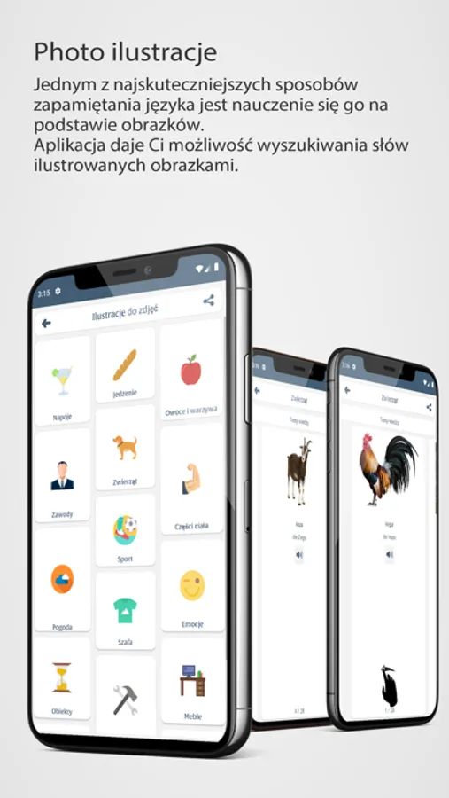 Jednym z najskuteczniejszych sposobów zapamiętania języka jest nauczenie się go na podstawie obrazków. Aplikacja daje Ci możliwość wyszukiwania słów ilustrowanych obrazkami.