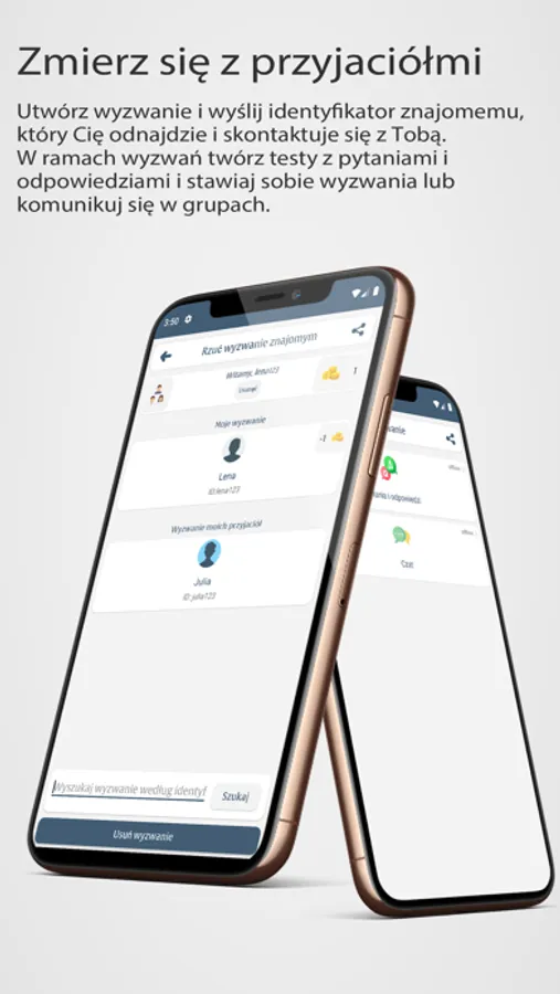 Utwórz wyzwanie i wyślij identyfikator znajomemu, który Cię odnajdzie i skontaktuje się z Tobą. W ramach wyzwań twórz testy z pytaniami i odpowiedziami i stawiaj sobie wyzwania lub komunikuj się w grupach.