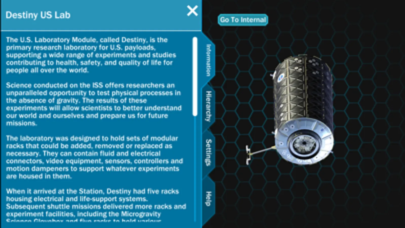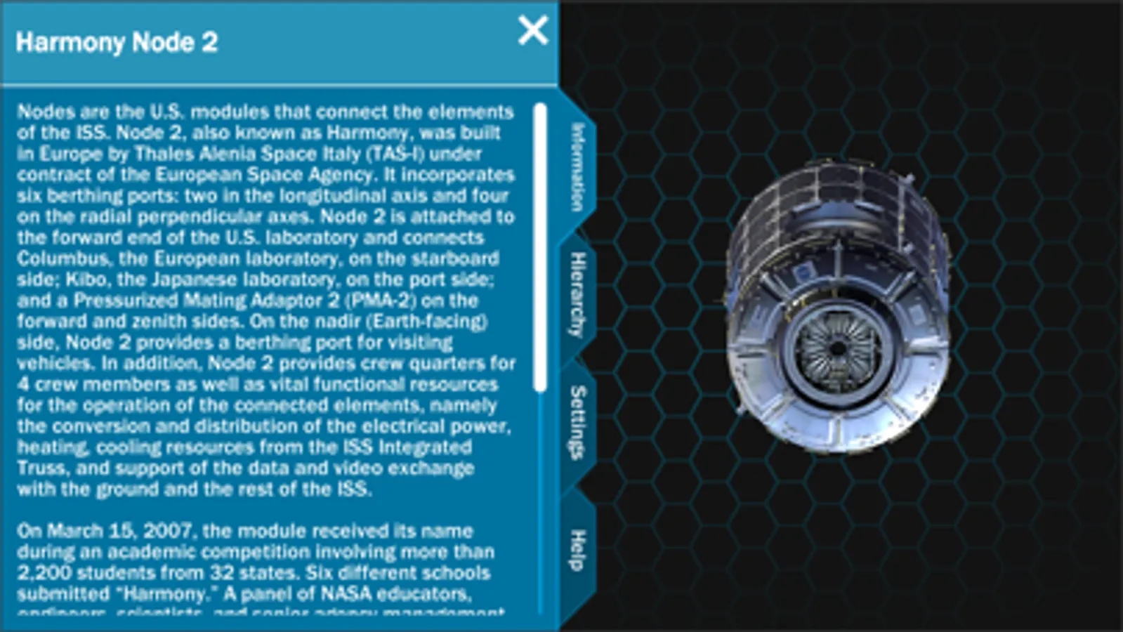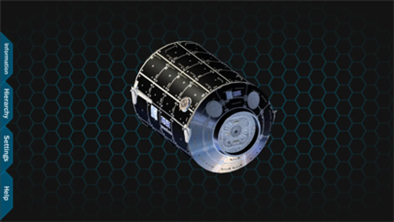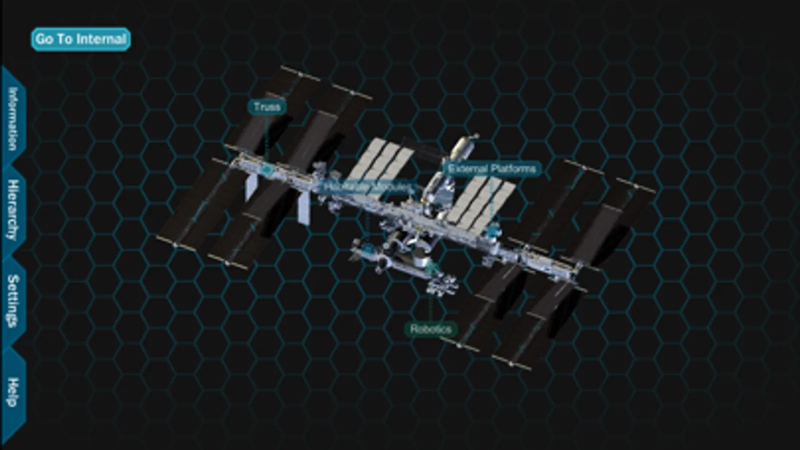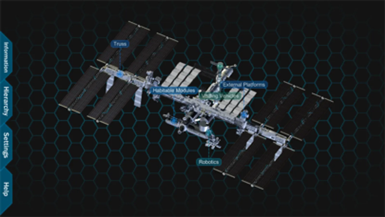 When the application starts, you can see a view of the entire ISS with category labels. Tabs are available on the left hand side of the screen which allow you access to information, the hierarchy, settings and application information. From this point, you can zoom into the station, revealing more labels of visible parts. The station can also be rotated to view from different angles. If a part is selected, the part is isolated so that you can focus on the specific piece. The information tab shows information about the currently isolated part.