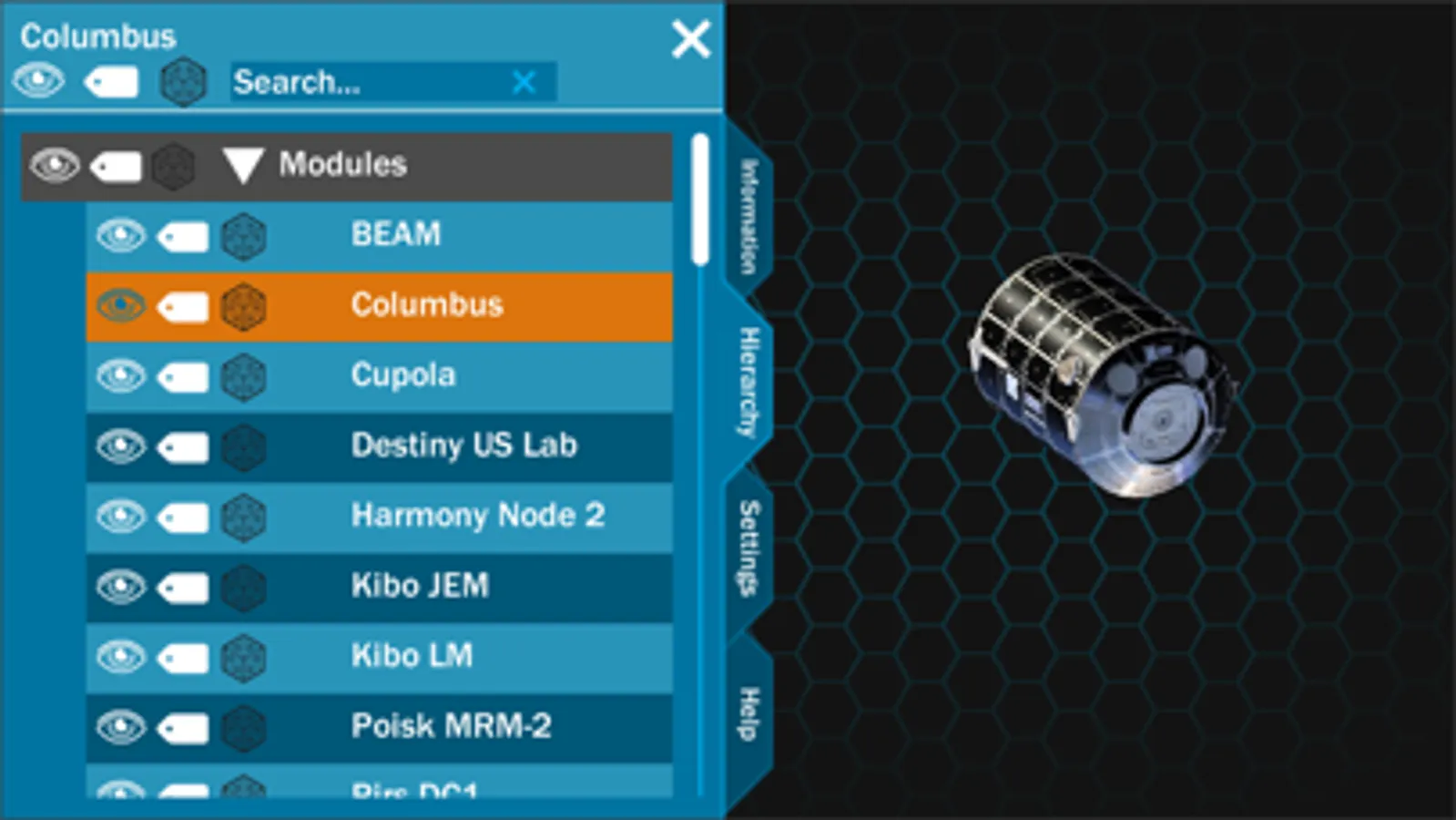 Inside the hierarchy tab, you can turn parts on or off, turn labels for parts on or off, turn parts transparent, or select a part to focus on. The parts are organized in a hierarchy to allow for systems to be described and displayed. This includes things such as truss, modules, and external platforms.