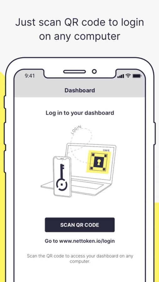 With Nettoken’s Authentication App, you have your Nettoken in your pocket and ready to securely access at your convenience. It is device agnostic. By simply scanning the QR code displayed on the Nettoken browser page, you are immediately signed in to your unique Nettoken dashboard - no password required. You can use the App again to log out remotely for convenience without compromising your security.