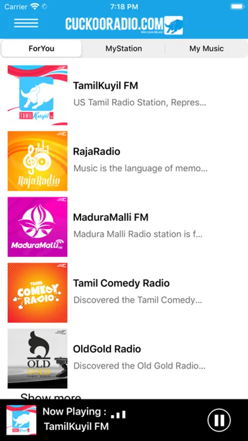 • Stream Cuckoo Radio best of Live and Artist Radio Stations, including TamilKuyil FM, MaduraMalli FM , SATamil FM, Tamil Comedy Radio,RajaRadio and OldGold Radio.