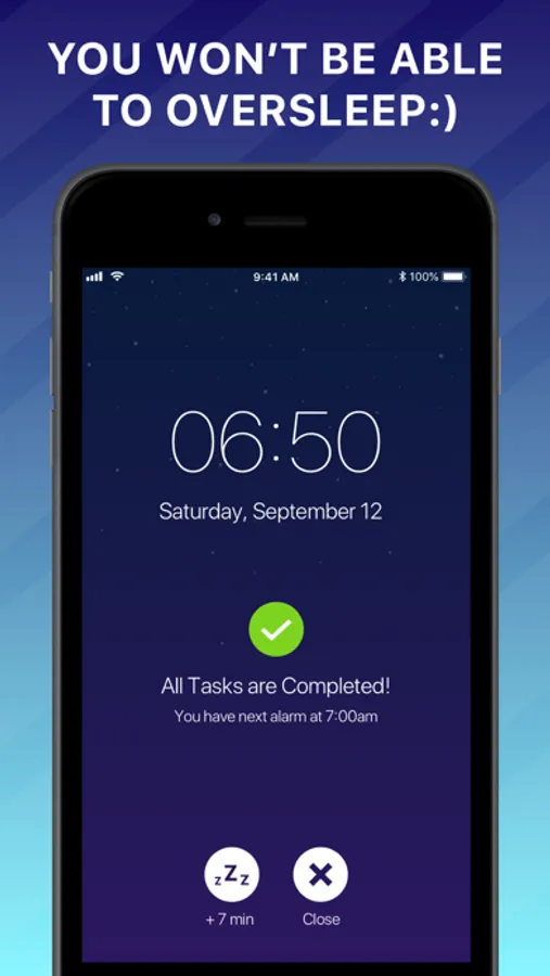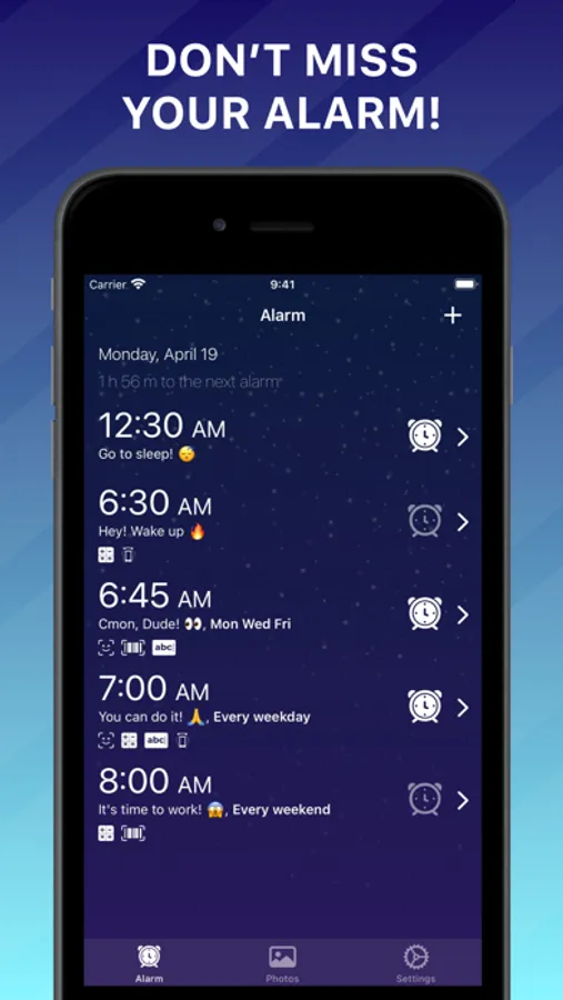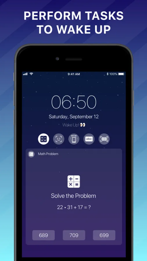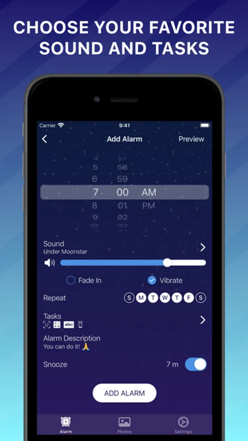 At first, select the time of waking up. Then select a ringtone to start your day with nice sounds or your own music. Also, there is an ability to add one or multiple tasks and in the morning be ready to complete them to stop the alarm. They are barcode scanning, face recognition, solving a math problem, word rewriting, and shaking the phone. If you just close the application in the morning, the alarm clock will start sending notifications, reminding you to complete the tasks.