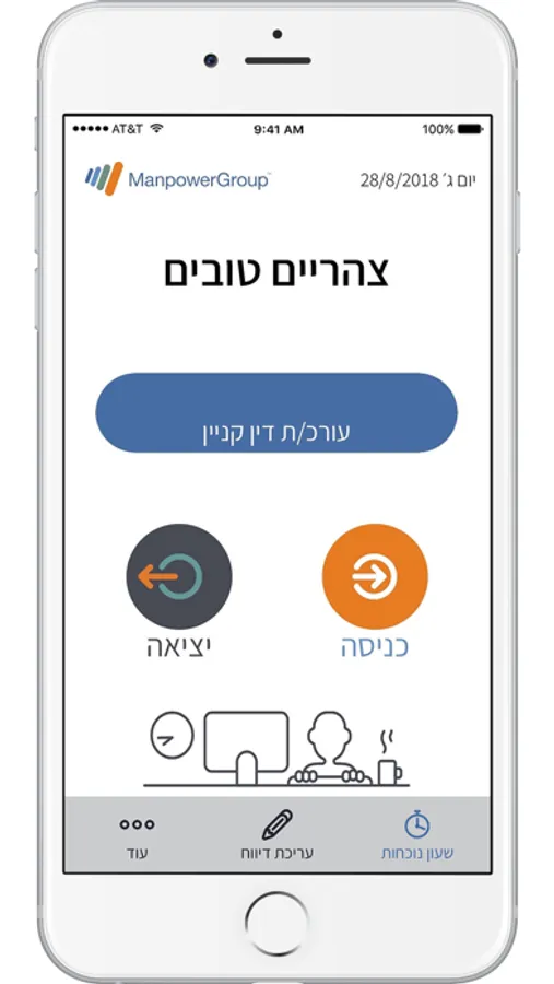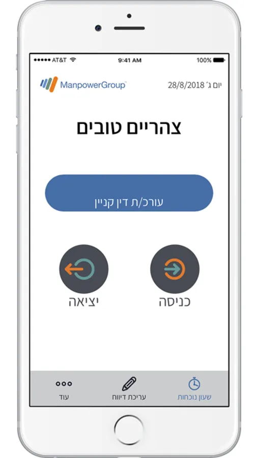 אפליקציית דיווח הנוכחות של ManpowerGroup Israel מאפשרת לעובדים לדווח, בצורה קלה וידידותית על כניסה ויציאה מהעבודה גם כשהנם מחוץ למשרד, להוסיף אסמכתאות להיעדרויות כמו מחלה ומילואים ולאשר את דיווח הנוכחות החודשי .