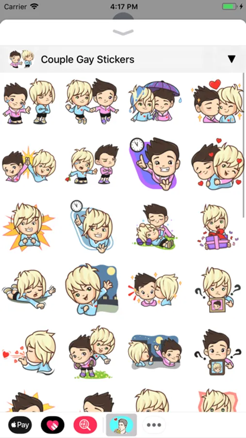 • Find new stickers—First tap the App Store icon, then tap the 4-ovals icon in the lower left to bring up the app drawer. Then, tap the + icon to access the Store.