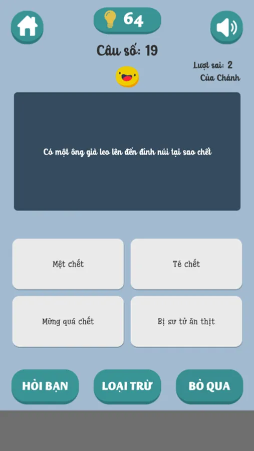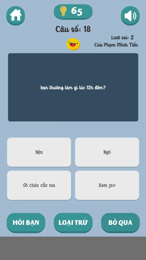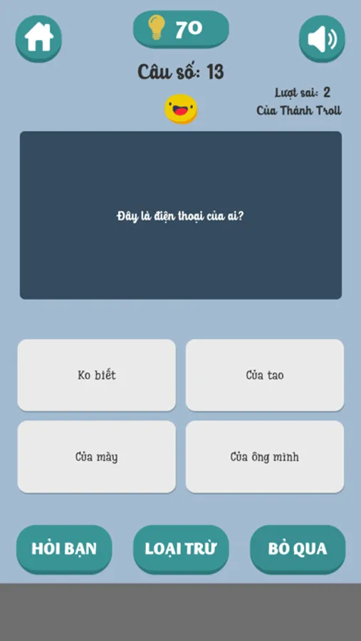 Bạn thường đi đố vui hại não bạn bè, hãy chơi Game Vui Hoi Ngu Do Vui Hai Nao để chơi khăm bạn bè nhiều hơn cùng với kho câu hỏi ngu hại não khổng lồ không bao giờ cạn kiệt. Những gói câu hỏi của Hỏi Ngu Đố Vui Hại Não sẽ liên tục được cập nhật qua những ý kiến đóng góp của người chơi.