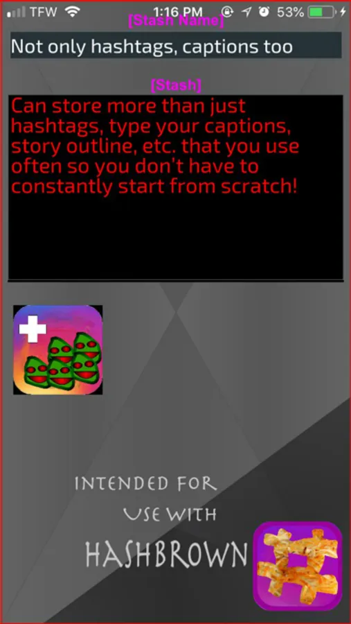 Store and Create custom hashtags from the HASHBROWN app or from anywhere else you gather them.