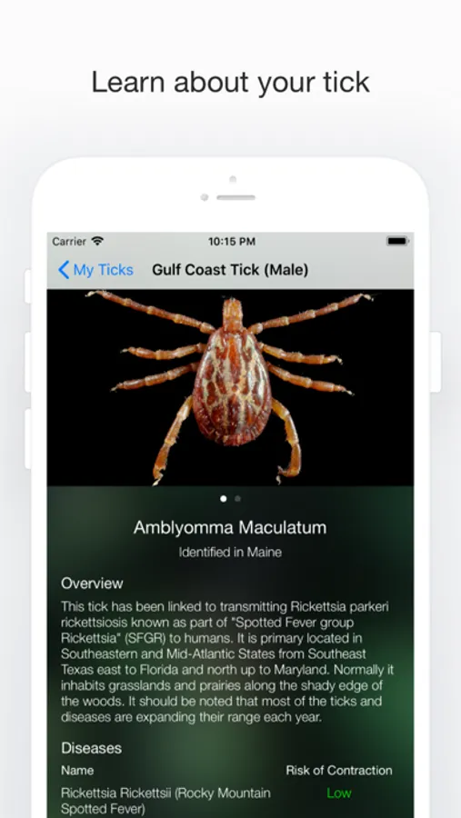 This app was not made by a medical professional and all information should not be taken as medical advice. Most of the information was taken from the CDC. The 'risk of contraction' section is based on estimates and information gathered from the CDC. The app is intended to inform you about ticks and the diseases they can carry, not to predict if you will or will not contract a disease from a tick.