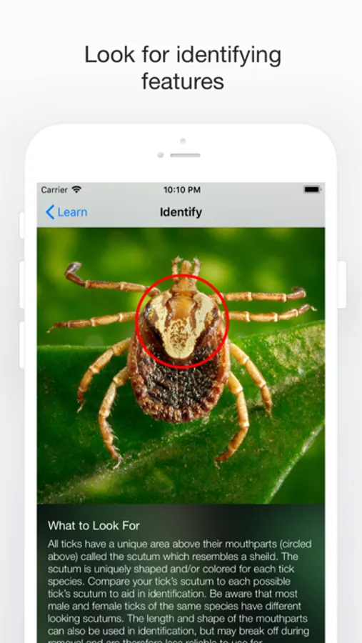This app uses image recognition, specifically a convolutional neural network, to aid in tick identification. The app analyzes the image of your tick and uses your location to rank the ticks with diseases in your area. You are presented with the possible ticks ranked by the image recognition system. If the image recognition system doesn't recognize a tick in your image, it will only present possible ticks based on your location. For help identifying your tick from the possible ticks, look in the 'Learn' section in the app to know what features to look for.