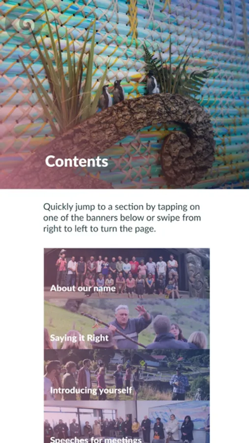 Interactive features within the app include pronunciation of Māori words, maps with Māori names and iwi groups, values (Ngā Mātāpono), and principles, mihimihi/pepeha (introductions), ngā mihi (greetings), poroporoaki (farewells), whakataukī (proverbs), and waiata (songs).
