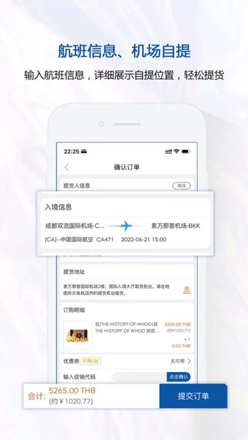 · 选中商品,一键下单,机场自提,省去繁琐的购物流程;