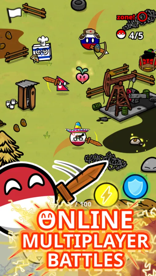 Battle Royale (online): Fife players in a lovely hand drawn world full of potatoes - and the last Countryball standing wins. Fight your way up the rankings with courage and skill and play online against your friends or join a random match with players all over the world.