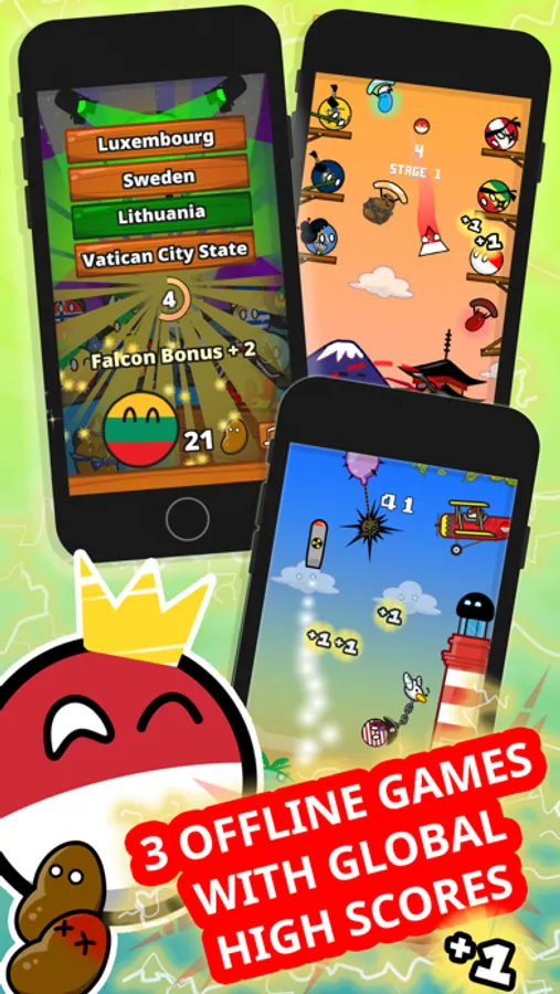Mostra a tutti che sei il vero campione di Countryball in tre fantastiche modalità di gioco! Lancia la tua Countryball nel cielo dei livelli splendidamente progettati e schiantarsi contro i tuoi avversari per raccogliere le patate e rompere il punteggio mondiale. La modalità Quiz è tutta una questione di cervello e velocità! Indovinate le bandiere nazionali della Countryball e diventate un quiz a quiz mostra patate milionario! Lasciate che il simpatico gabbiano voli in giro al sole e schivate le buffe figure per raccogliere le patate. Date al vostro Countryball un nuovo look individuale basato su più di 360 bandiere e vari oggetti interessanti. Create i vostri unici meme di Countryball con il creatore di meme facile da usare e condivideteli su qualsiasi piattaforma di social media.