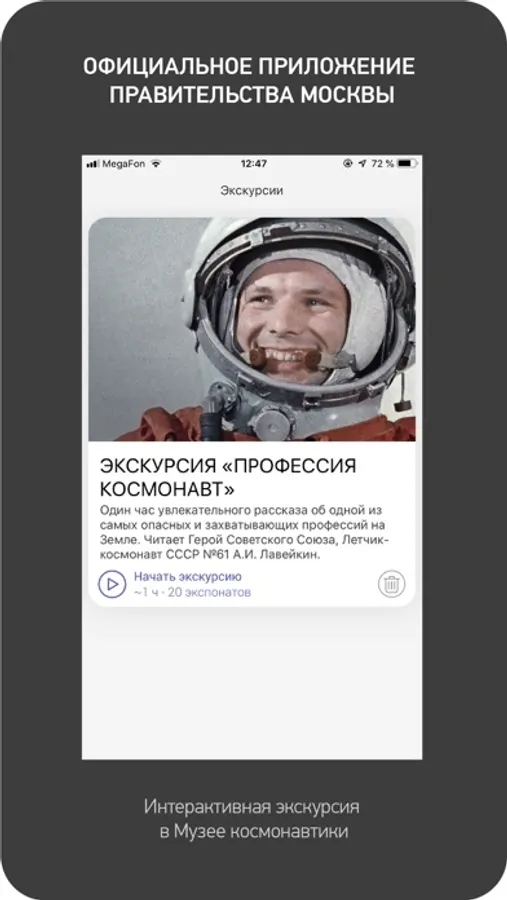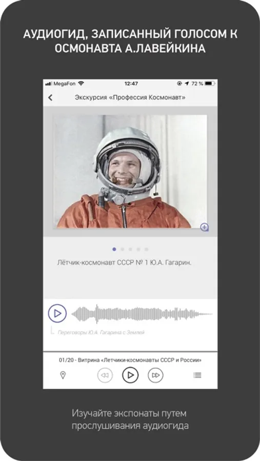 В первой версии приложения доступны две экскурсии по Музею космонавтики и Дому-музею С.П. Королева. Текст для аудиогида зачитывал настоящий космонавт: Александр Иванович Лавейкин, Герой Советского Союза, лётчик-космонавт СССР