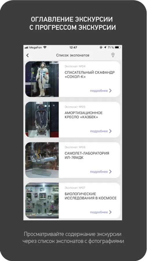 - Просматривать содержание экскурсии и краткую информацию об экспонатах, представленных в ней.