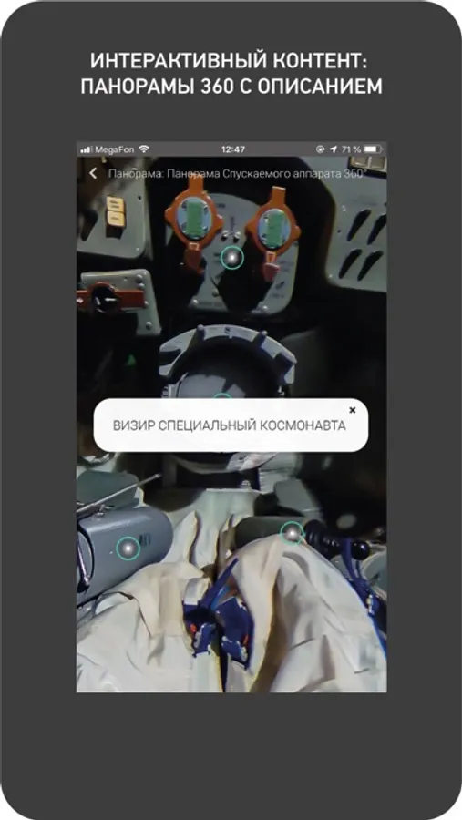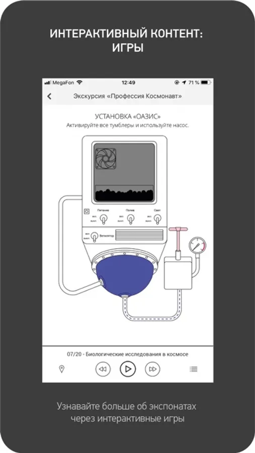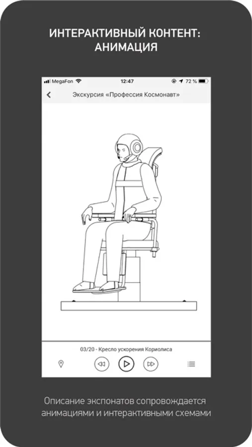 - Изучать экспонаты с помощью аудиогида, описаний к экспонатам и мультимедийного контента (фото, видео, анимации).