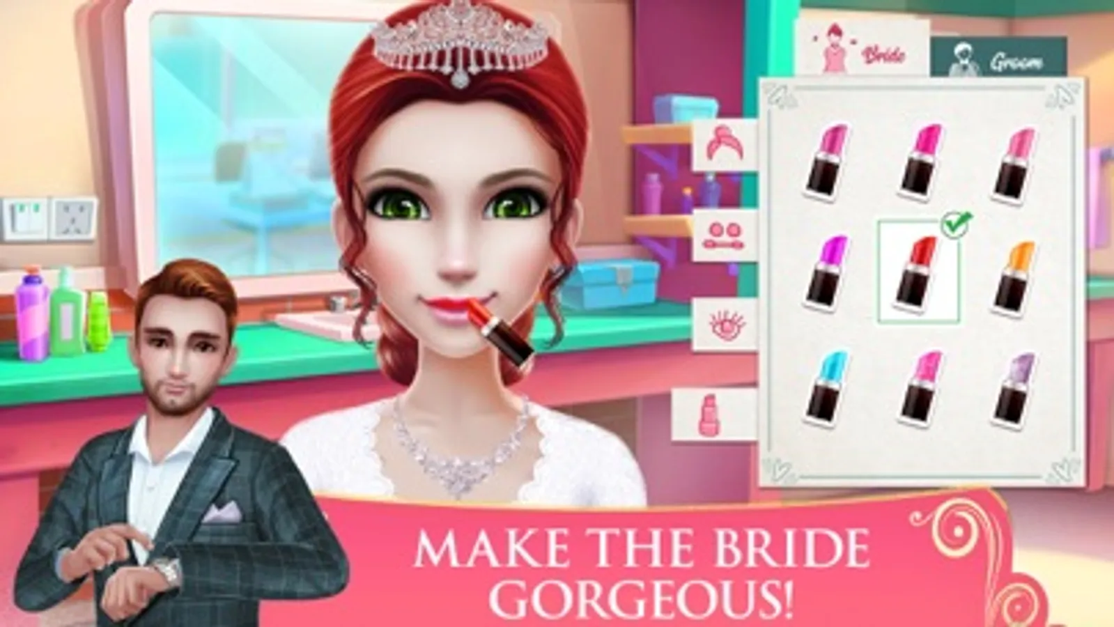 > Make the wedding party shine! Help the beautician put stunning makeup on the brides and style the grooms’ beards.