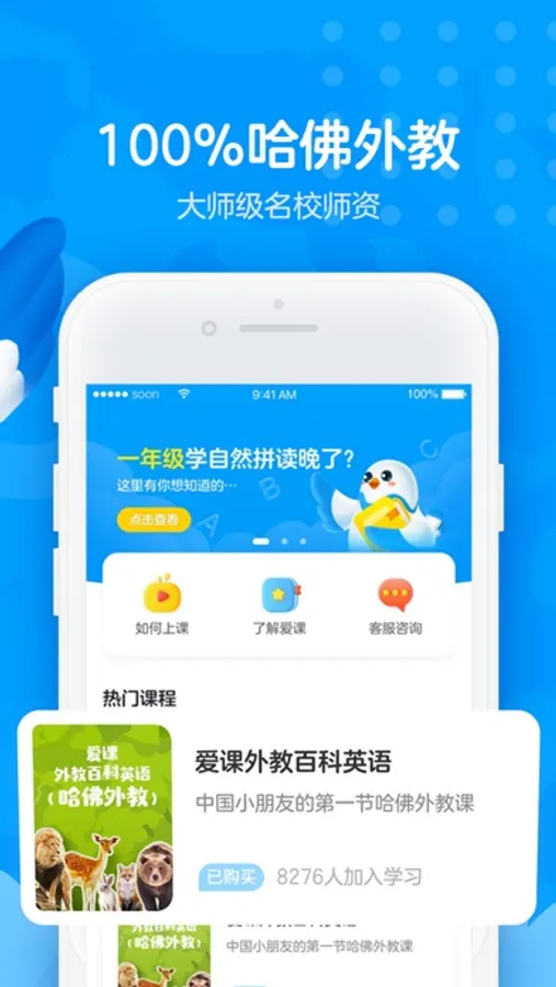AirCourse爱课平台开设了哈佛外教百科英语、爱课六级少儿英语、少儿英语大师拼读课堂等众多专为中国小朋友设计的大师级少儿外教课程,并且受到了超130万中国小朋友的喜爱。