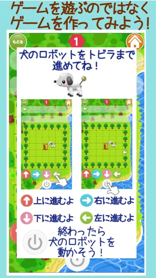 可愛い犬のロボットをコマンドを入力してゴール(扉)まで進めましょう!