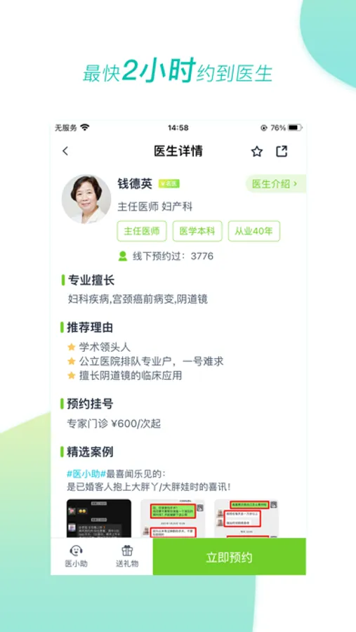 医和你约名医,为患者提供快速预约名医,最快2小时可约到想要就诊的医生,300+来自全国三甲医院医生进驻。预约后,医小助会提供全程跟诊服务,让患者就医更轻松便捷。