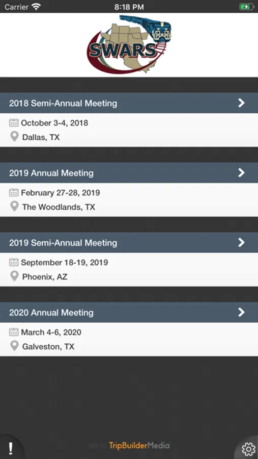 This TripBuilder Multi Event Mobile™ app is provided at no charge by the Southwest Association of Rail Shippers (SWARS). It was designed and developed by TripBuilder Media Inc. If you have any questions, or need any support regarding how to use this app, please submit a Support Ticket (located within the Help icon in the app).