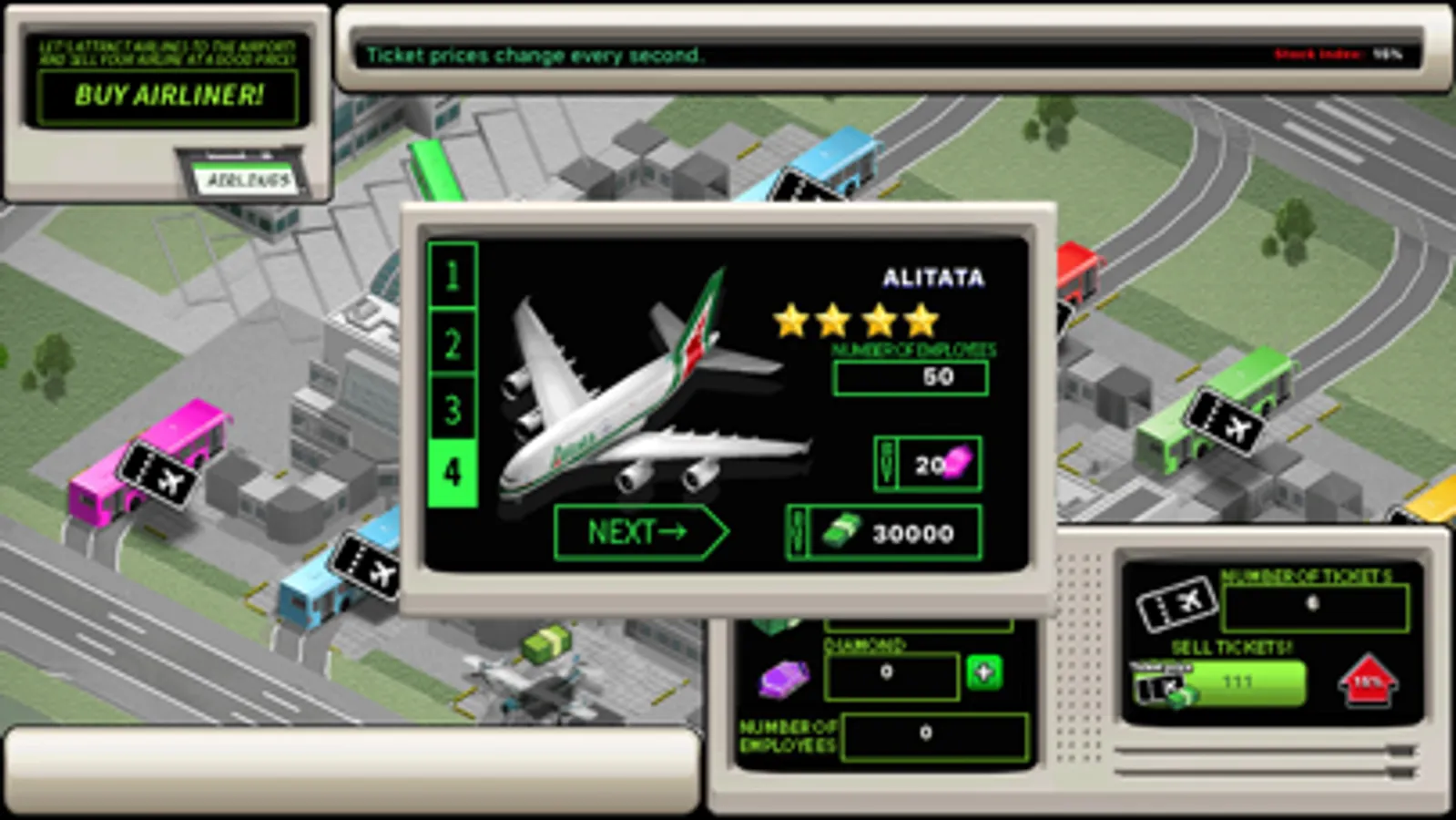 You are the owner of the airport and you can be the owner of many airlines. Use your airline's stock market to become a huge rich man! You can be the owner of a huge airplane!
