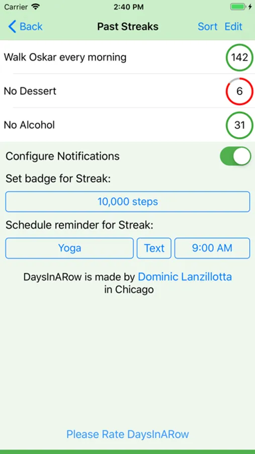 - Review past restarted and finished streaks and sort them by length of streak or name
