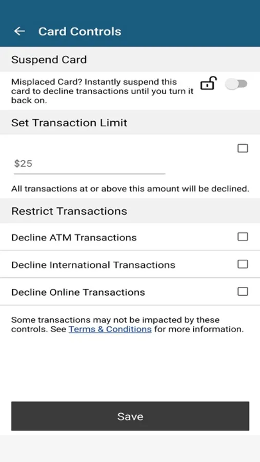 • Turn your debit or credit card on/off. Easily lock and unlock your cards if they are lost or stolen.