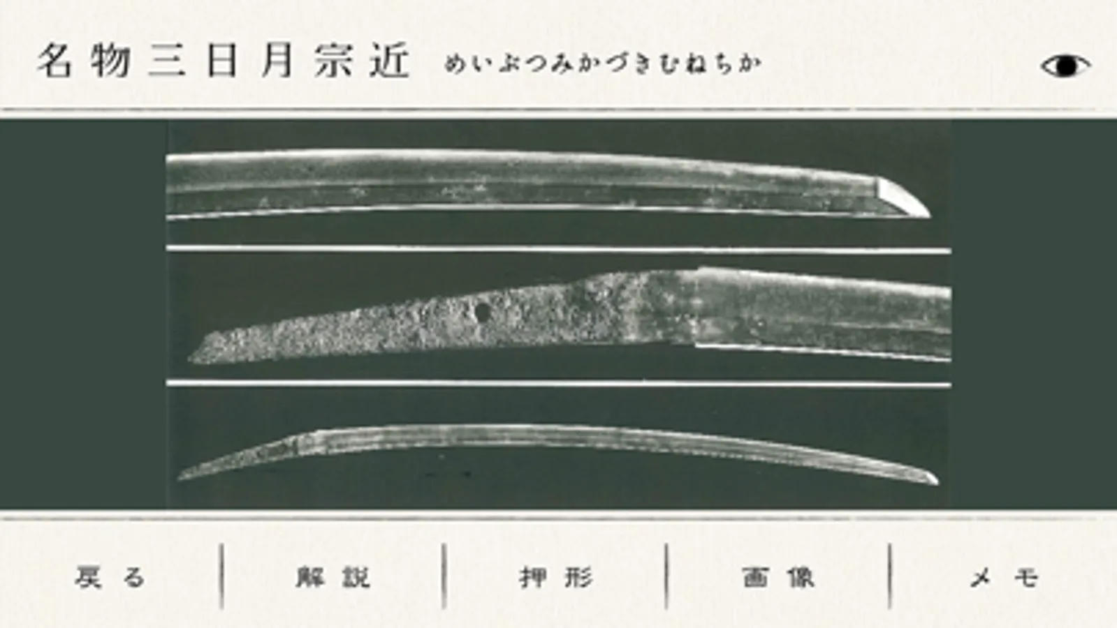 日本刀はその他の多くの歴史的な文化財と同じく多くの人々の想いが今日につながって存在しているものです。日本刀には武器としての時代があり、精神的な支えとしての時代があり、美術品や文化財として管理された時代がありました。日本刀は刀そのものだけでなく、その資料にも様々な方の想いがあります。 特に画像や押形などは、出版社さんや当時作成することに関わった多くの方の尽力で出来上がっております。今後それらの資料情報を多くの方に知ってもらい利用してもらうことで後世につなぐことができればと思います。 継続可能な活動とするために、それらの資料をご利用いただくにあたり、画像と押形については、課金システムとさせていただきました。刀剣のことをより知っていただけるアプリとなるよう、今後も機能追加を予定しております。