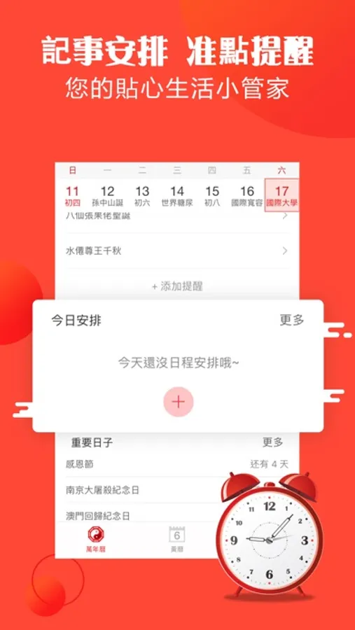 3、节气放假提醒:二十四节气、国家法定节假日提醒、佛历道历统统都有;