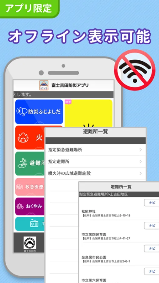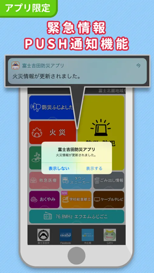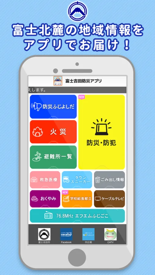 富士北麓地域を中心とした防災・防犯情報、災害情報や避難所情報などをお伝えします。
